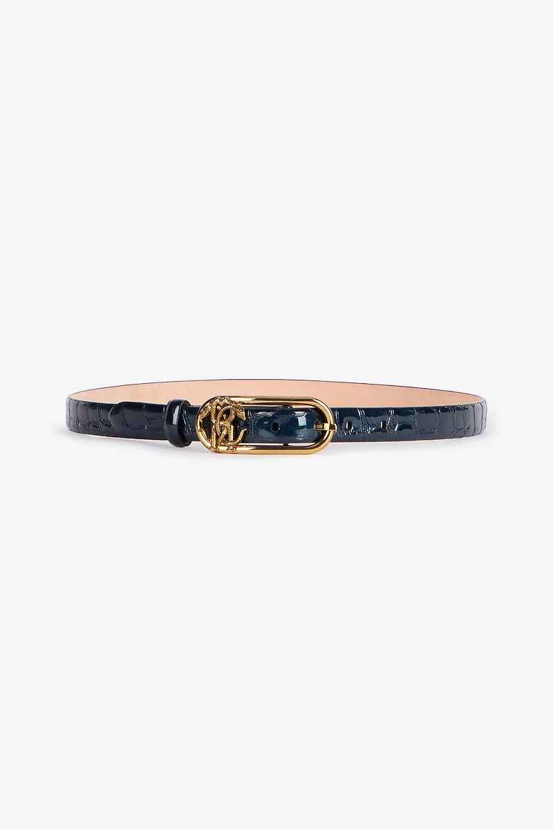 Roberto Cavalli once again reinvents his signature styles, creating a slim belt made of genuine leather, defined by a rich crocodile scale-effect embossing illuminated with subtle glitter and finished with an exclusive glossy sheen. The accessory is also decorated with the Mirror Snake Monogram that enhances the oval buckle, while the prong is embellished with the engraved Roberto Cavalli logo.