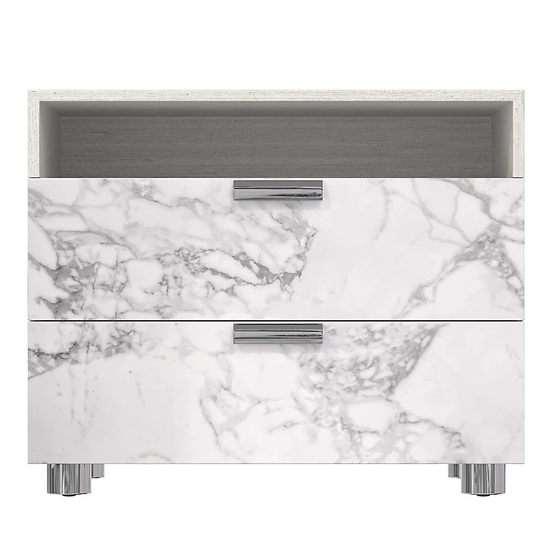 Bernhardt Startum Stone 2 Drawer Nightstand.Color:Gray.Material:Ash wood case; Arabescato stone drawer front; metal drawer pulls and legs.
