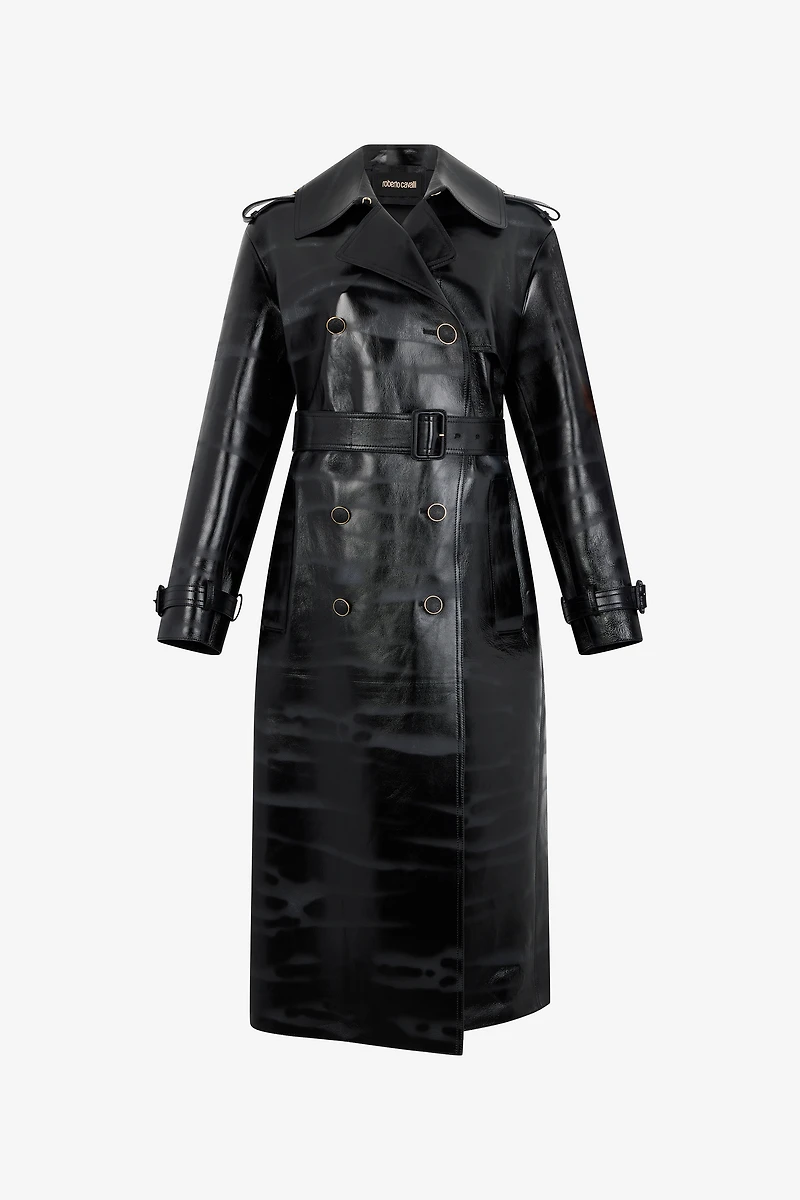 Roberto Cavalli revamps timeless elegance with this long trench coat with classic details such as buttoned epaulets on the shoulders, a belt with a buckle at the waist and a double-breasted design. The model, made of genuine leather, is complete with more functional details such as the two side welt pockets, the straps with buckles at the wrists and the back vent.