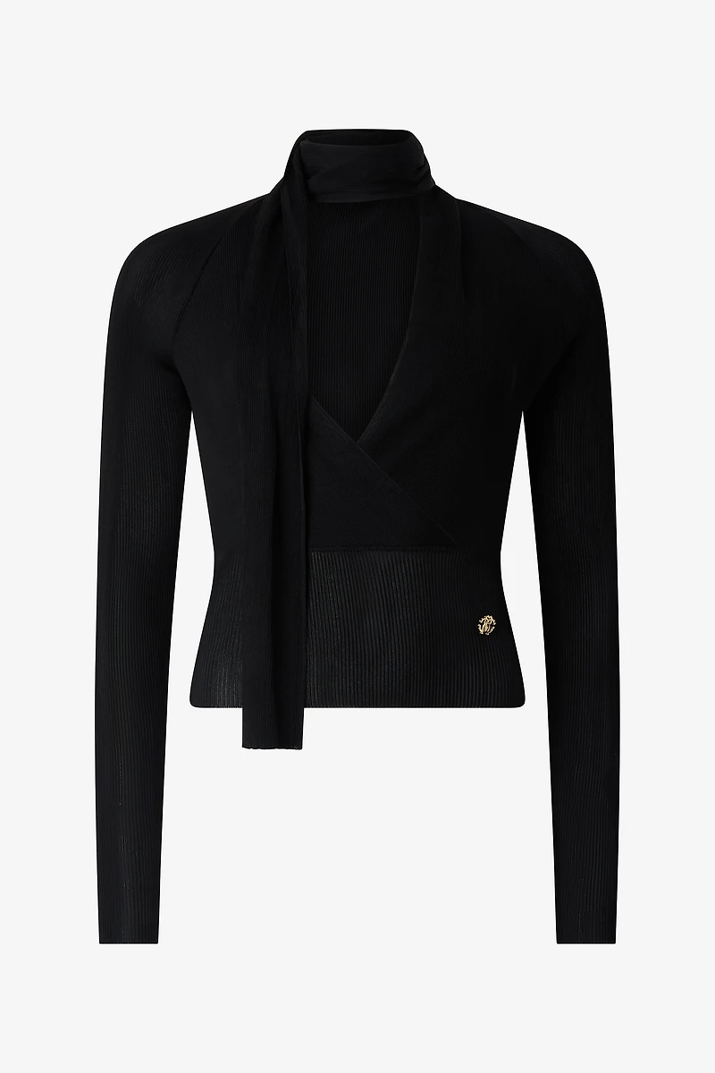 This long-sleeve sweater by Roberto Cavalli embodies effortless, contemporary luxury. The wrap-over design of the model creates a deep V-neckline topped with an elegant lavallière to be wrapped around the neck, while the refined rib-knit adds an extra touch of comfort to the garment. The garment is enhanced at the front with the iconic RC Monogram in gold-tone metal, applied at the hem.