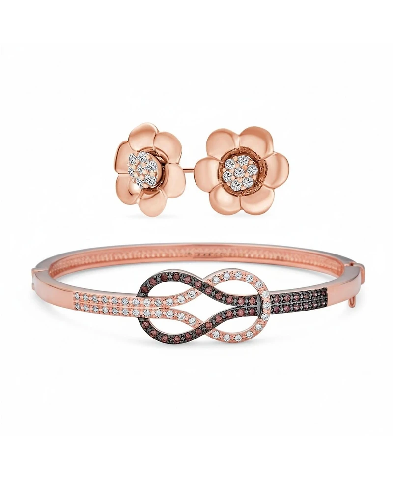 This romantic jewelry set features a tri-tone Cz love knot infinity bangle with chocolate-colored stones symbolizing everlasting love, paired with delicate rose gold floral Cz stud earrings with removable petal accents. Perfect for gifting or adding a touch of elegance and playful charm to any outfit.