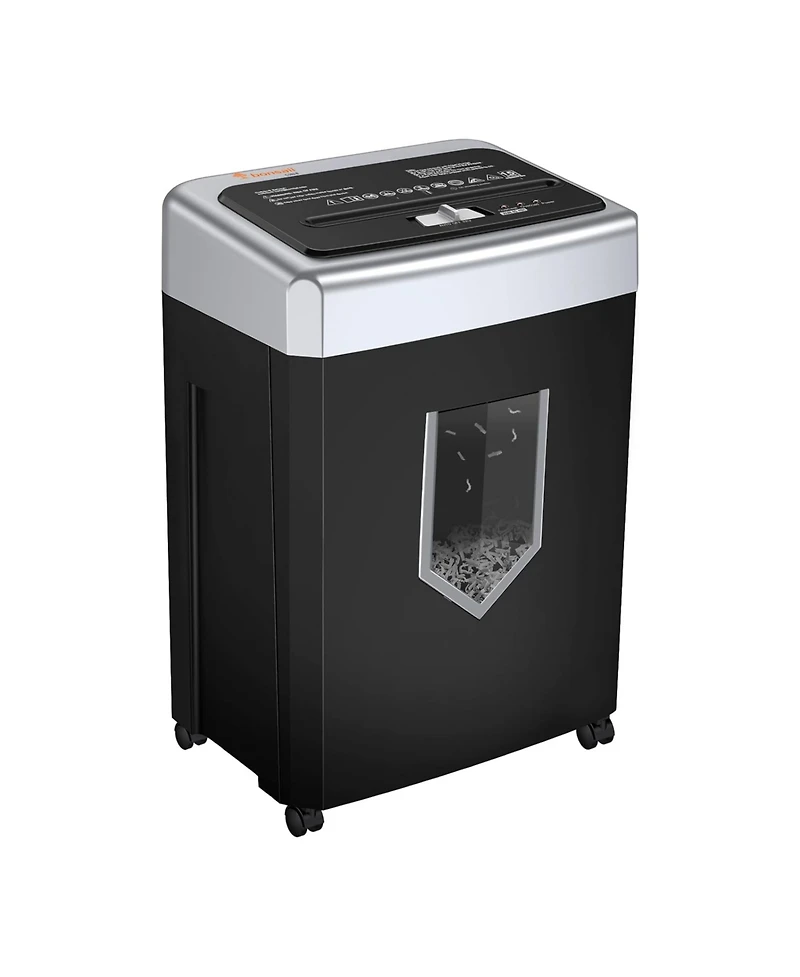 The Bonsaii 15-sheet heavy-duty crosscut paper shredder is ideal for office and home use, shredding paper, credit cards, CDs, mail, and staples into 13/64"" x 63/64"" particles for security. Its patented cooling system allows 40 minutes of continuous use, handling up to 2,900 sheets without overheating. Auto start/stop/reverse and Led indicators make operation easy while preventing jams. A 5-gallon pull-out bin with a clear window holds about 350 sheets, and 360° swivel casters offer mobility. Operating at just 60dB, it s quiet enough for shared workspaces. Includes a 1-year warranty. Note: After 40 minutes of use, a 40-minute cooldown is required due to overheat protection. Each unit is tested before shipping, so paper shreds may be present.