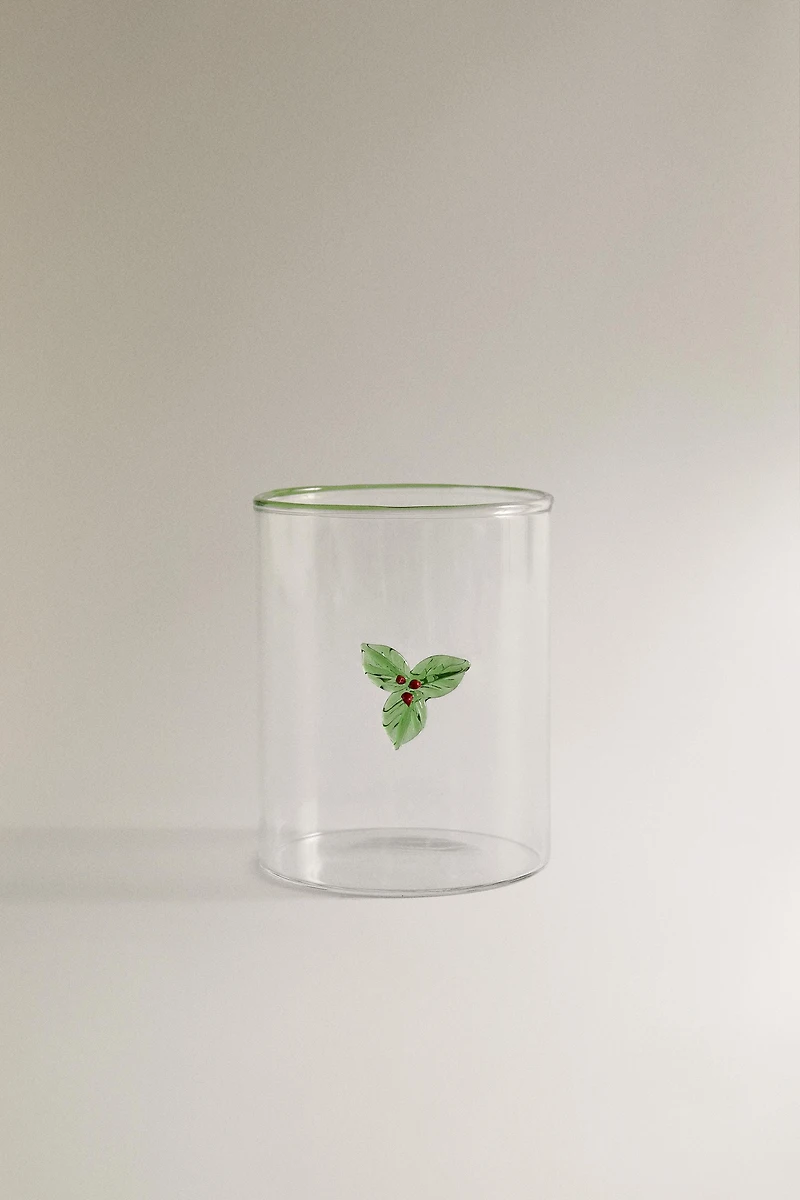 Transparent borosilicate glass tumbler, decorated with a Christmas figure and contrast-colored edge.