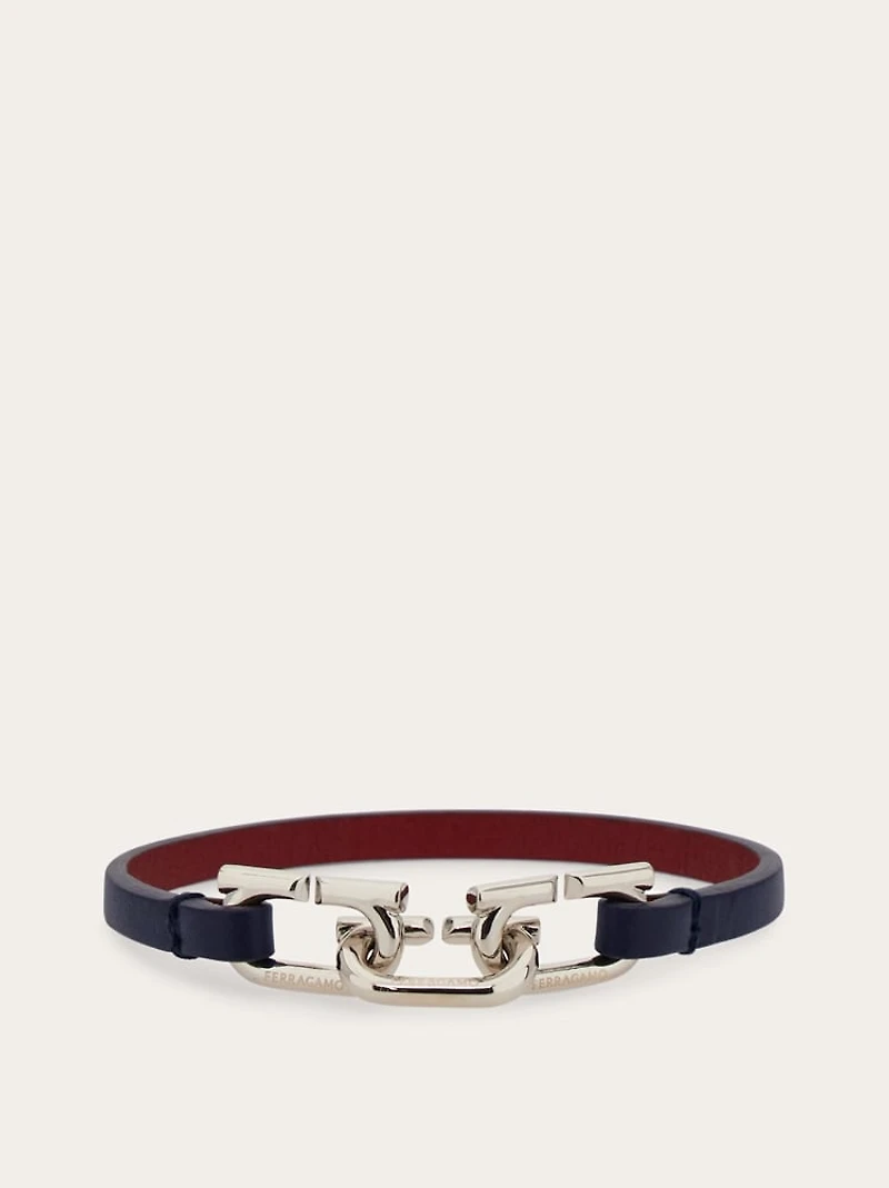 Leather bracelet featuring contrasting tones on each side. The Gancini-shaped metal clasp can be extended by adding a third central element for a customizable fit.