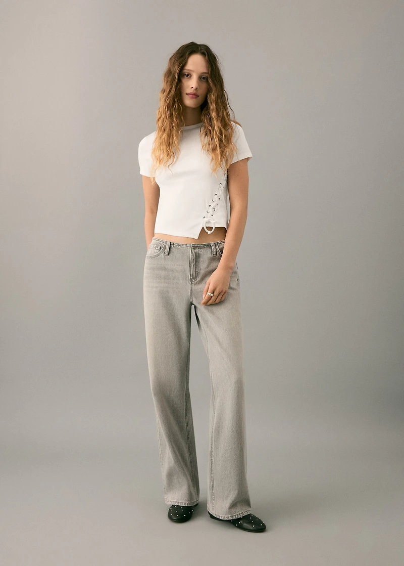 100% cotton fabric. Short design. Round neckline. Short sleeve. Braided cord detail. Asymmetric hem.