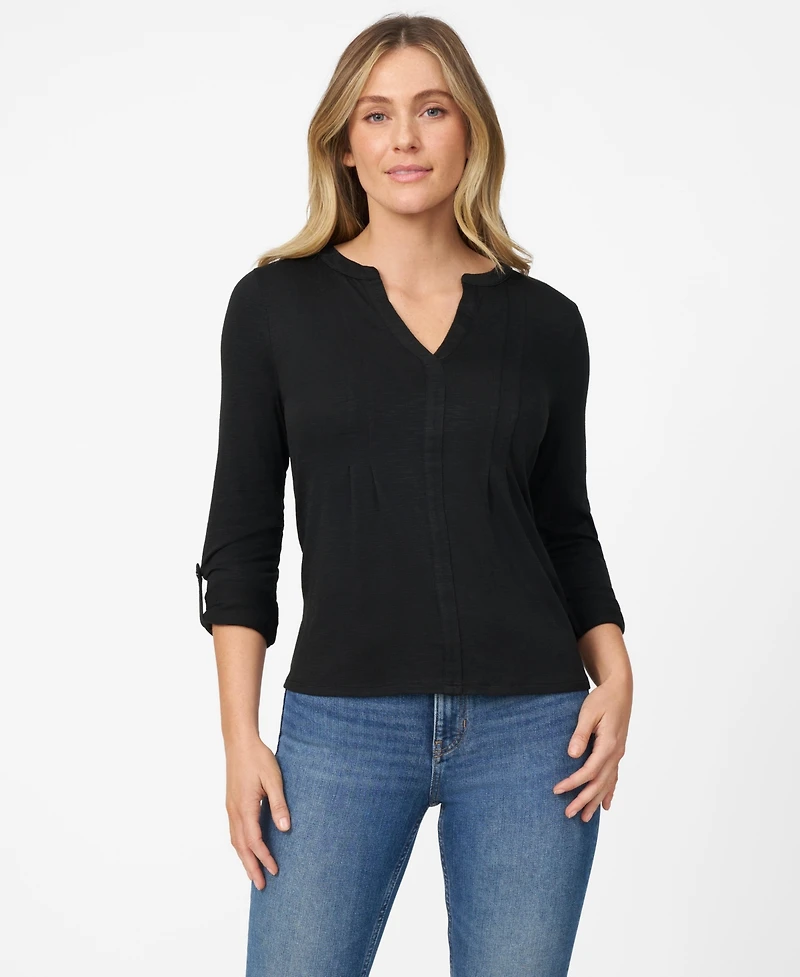 Simple, refined, and ready for anything. Featuring pintuck pleating, 3/4 roll-tab sleeves and a henley design, this top makes getting dressed easier than ever. Look good, feel even better in this must-have style.