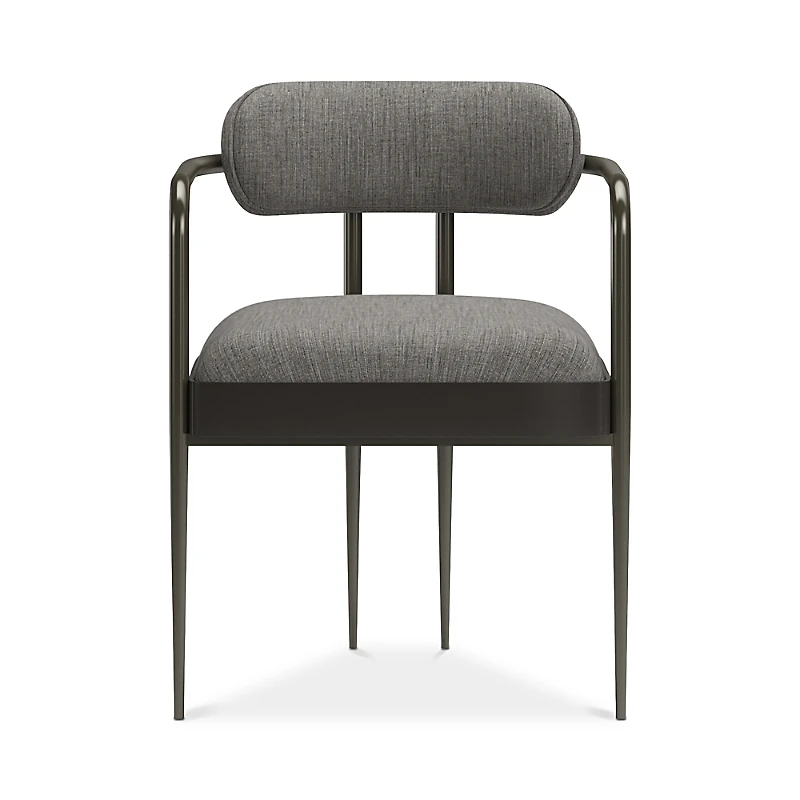 Light in scale but dark and sultry, this armed dining chair has a sinewy silhouette. Emphasis draws on parallel lines and an elegance of design to make a statement of modernity. From simplicity, comes sophistication in the chair's curved metal arms in Brushed Deep Bronze. The chair has a floating, bowed back and wood-framed seat in Seal Skin and a tight upholstered seat in Mink woven slub fabric.
