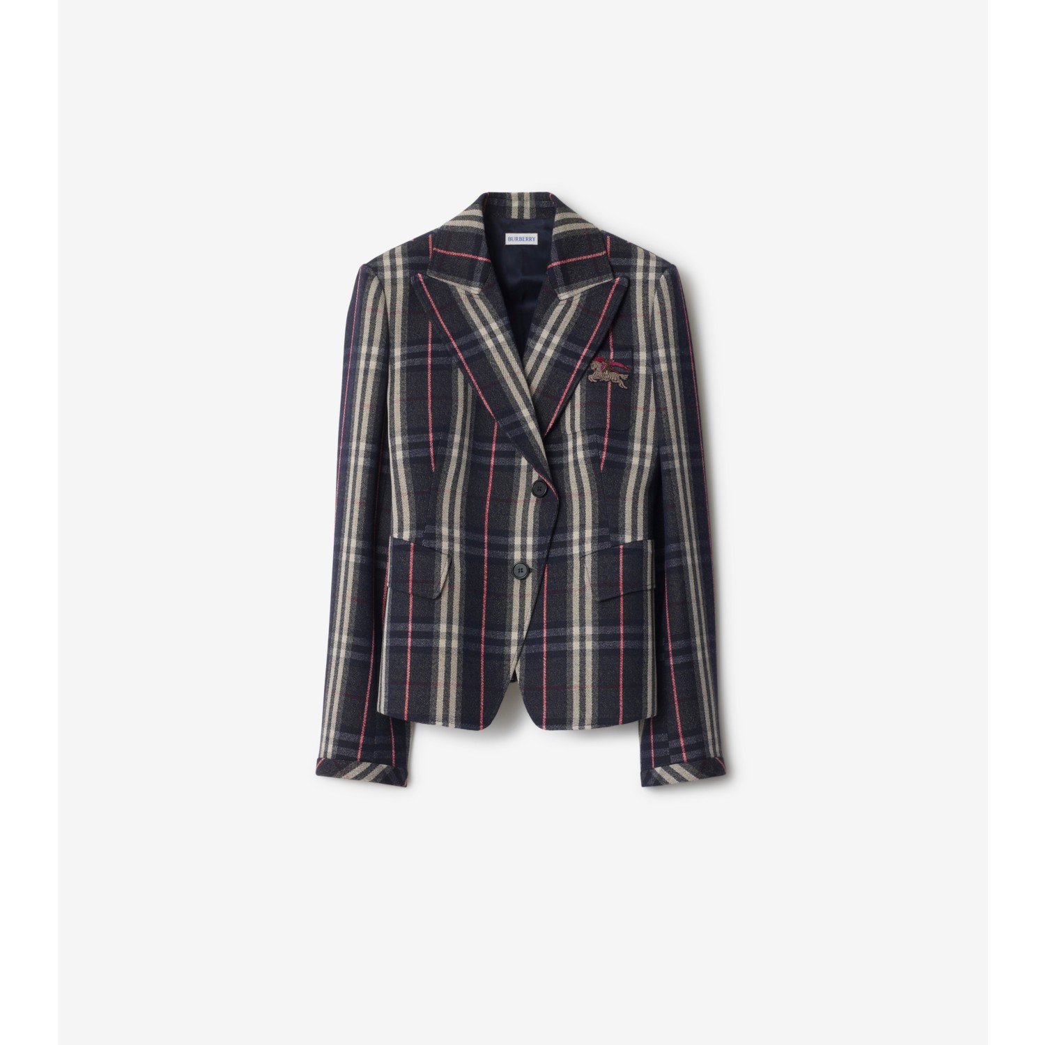 A single-breasted jacket in wool woven with the Burberry Check, tailored in Italy to a slim fit with a lightly structured shape and asymmetric closure. The chest pocket is hand-applied with an Equestrian Knight Design badge featuring intricate metallic beading and embroidery. Single-breasted button closure Peak lapels Chest patch pocket, side flap pockets Fully lined, half-canvas construction, padded shoulder Comes with a garment bag