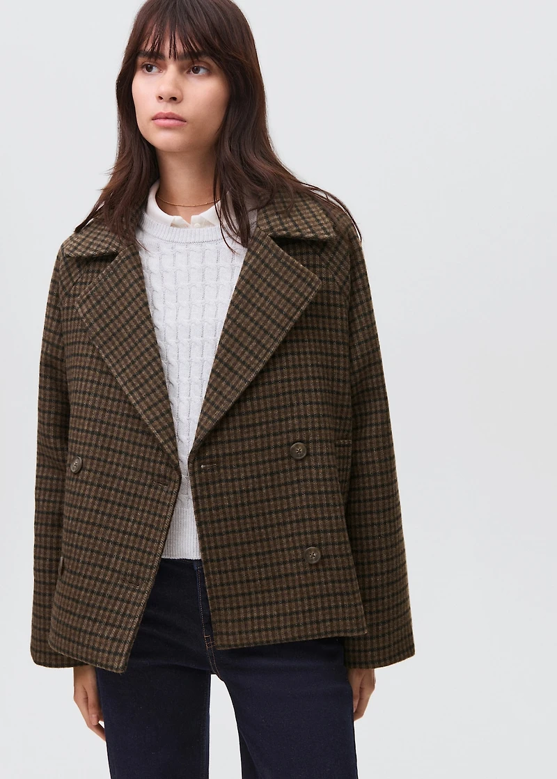 Wool fabric. Check fabric. Straight design. Short design. Notched lapel collar. Long sleeves. Crossed V-neck with button fastening. Two side pockets.