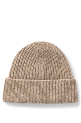 A cozy beanie hat with a logo flag in synthetic coated fabric by BOSS. This accessory is knitted in wool, silk and bison yarn.