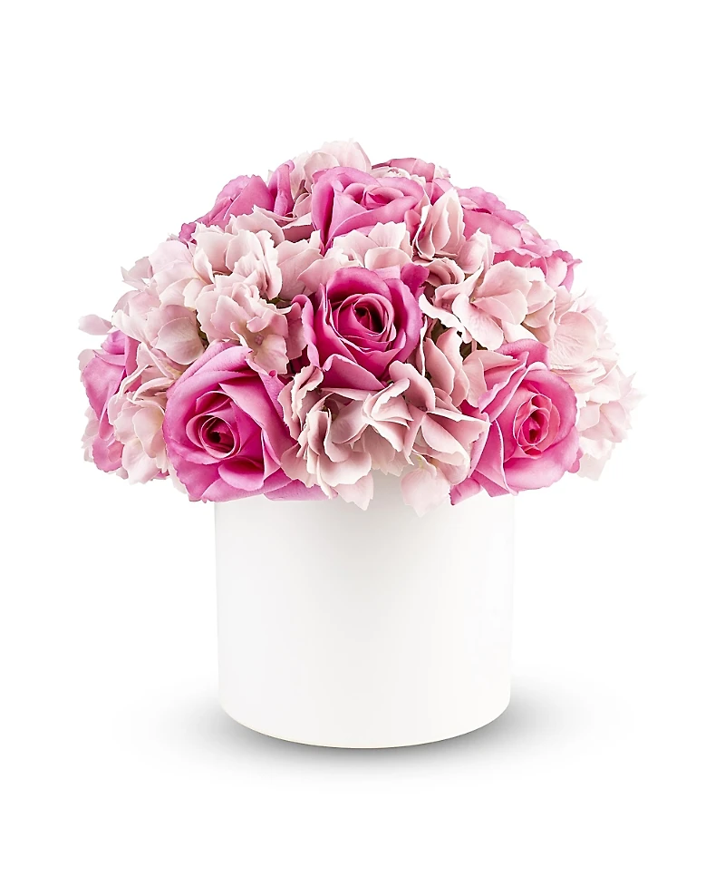The Yves Arrangement is the crown jewel of our latest real touch drop at CocoBella. Meticulously handcrafted from the finest faux florals, this stunning creation showcases a resplendent fuchsia and blush colors mixed with roses and hydrangeas gracefully encased in a white matte vase. Each petal exudes an almost tangible realness, allowing you to experience the allure of nature's best without the need for maintenance.