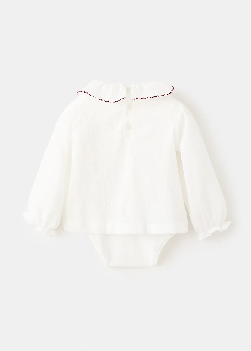 100% cotton fabric. Bodycon design. Embroidered design. Peter Pan collar. Embroidery Neck Detail. Long sleeves with ribbed trims. Button closure at the back. Bottom opening with button closure. Christmas Collection.