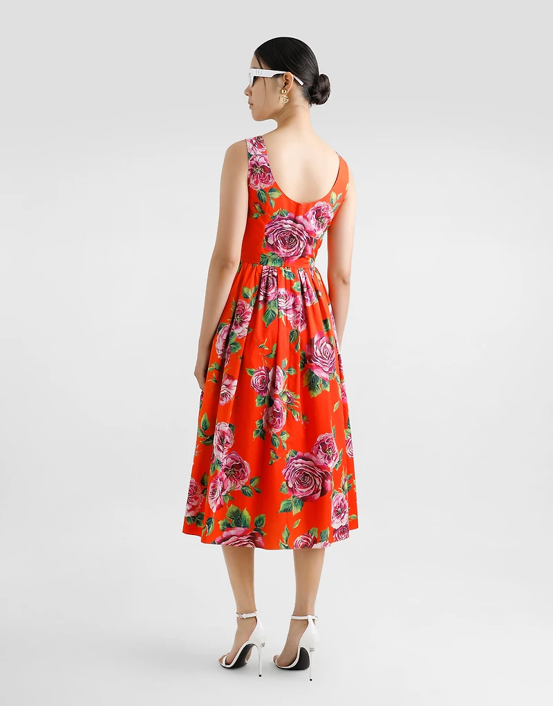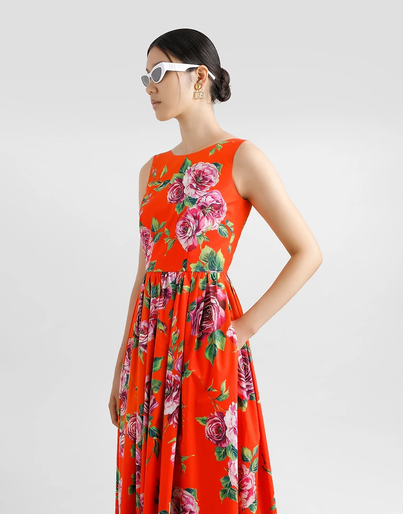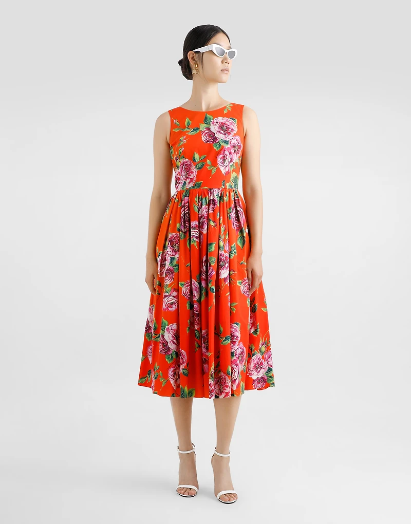 Shop Cotton calf-length babydoll dress with rose print in Los Angeles, CA