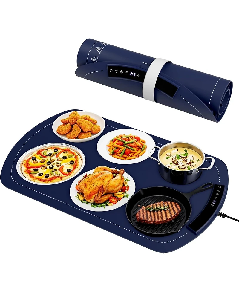 Keep meals perfectly warm with 7 precise temperature settings (104°F-212°F). This ultra-thin mat heats evenly across its large surface, holding 5-6 plates at ideal serving temperature. Features 5-hour timer, child lock, and 250W energy-efficient operation.Rolls up for compact storage - perfect for home kitchens, parties and travel.