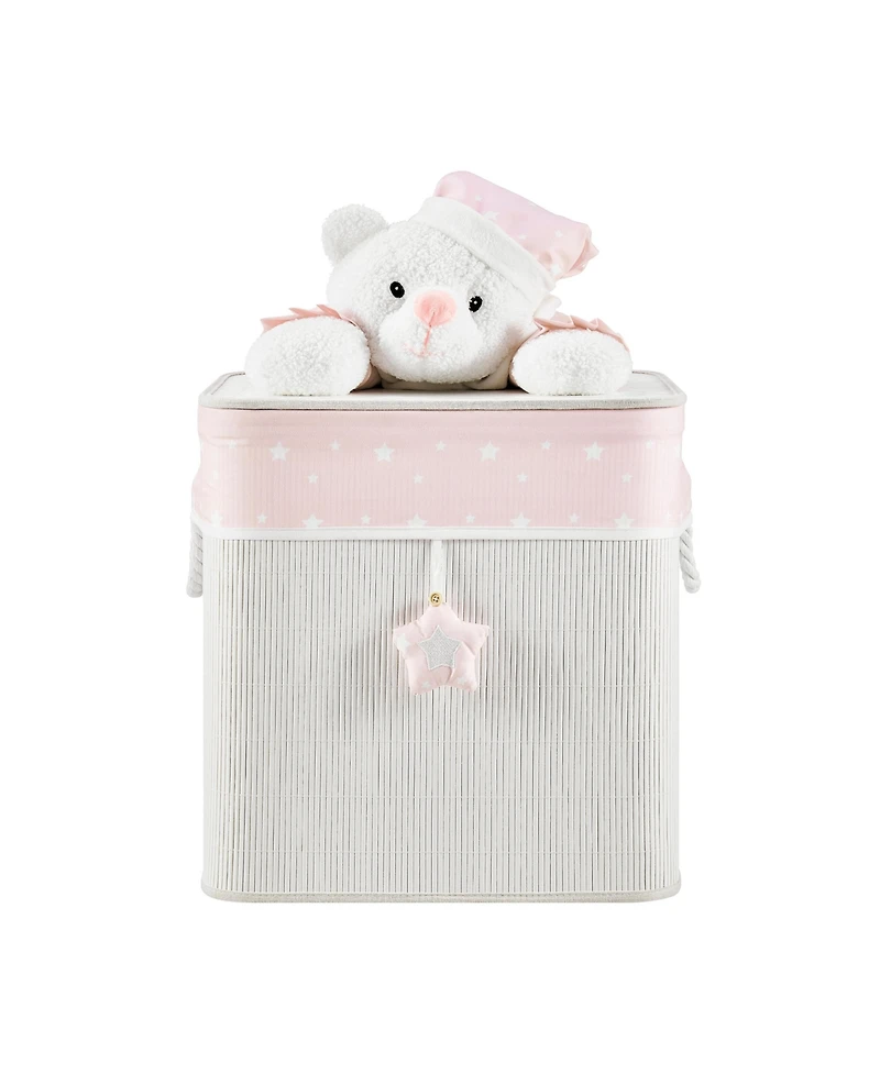 The Pink and White Bamboo Kids Laundry Hamper combines utility and whimsy to offer the perfect laundry companion or toy storage solution in your children s room. The compact design easily fits in the corner of any room, maximizing organization with playful flair. This basket combines sturdy bamboo construction with a soft pink fabric liner printed with white stars. The liner also features a plush pink star hanging off the front of the hamper. The removable lid of this toy storage or laundry hamper is adorned with a plush white teddy bear in light pink pajamas, enhancing the sentimental charm of this classic kids laundry hamper. Items stored in the hamper are neatly out of sight, whether you choose to store clothes, toys, or other items in this plush lidded hamper. The bamboo is lightweight so it is also easily collapsible, folding completely flat for convenient storage. Cream white braided rope handles on either side add further portability.