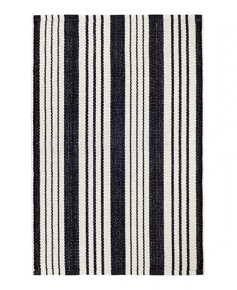 Get the best of both worlds with this durable, washable, and eco-friendly indoor/outdoor rug in a classic black and ivory stripe. Blends beautifully into both traditional and modern spaces.