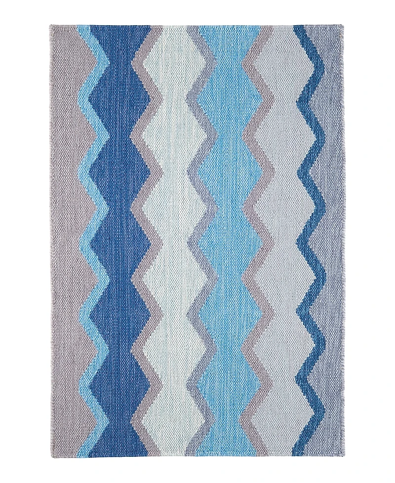 Geometric rik-rak lines in atmospheric tonal hues create a bold presence. This uniquely patterned washable indoor/outdoor rug is flatwoven from resilient threads that feel as soft as cotton but will stand up to whatever everyday life brings its way. Designed by Kit Kemp, Founder and Creative Director of Firmdale Hotels, in collaboration with Annie Selke.