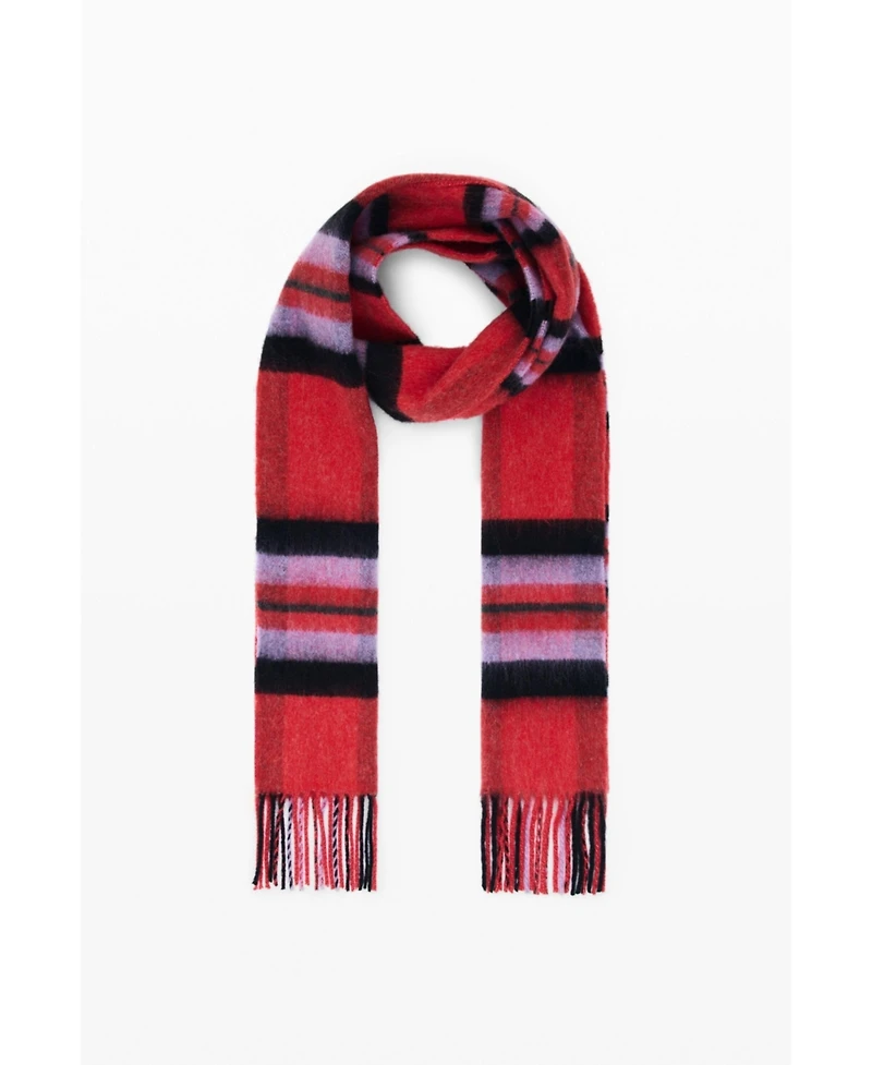 Long scarf made of fabric with check patterns in aubergine and red tones, with fringes at the ends. Rectangular design and visible softness in the texture.