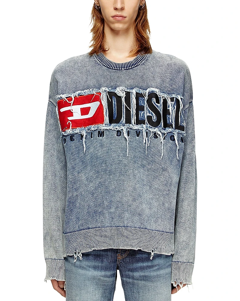 This sweater deep dives into Diesel's denim Dna through its lived-in, marbled hue and statement logo-embroidered patch in frayed denim. Knitted from indigo-dyed cotton, it has a drop-shoulder silhouette and distressed ribbed trims.