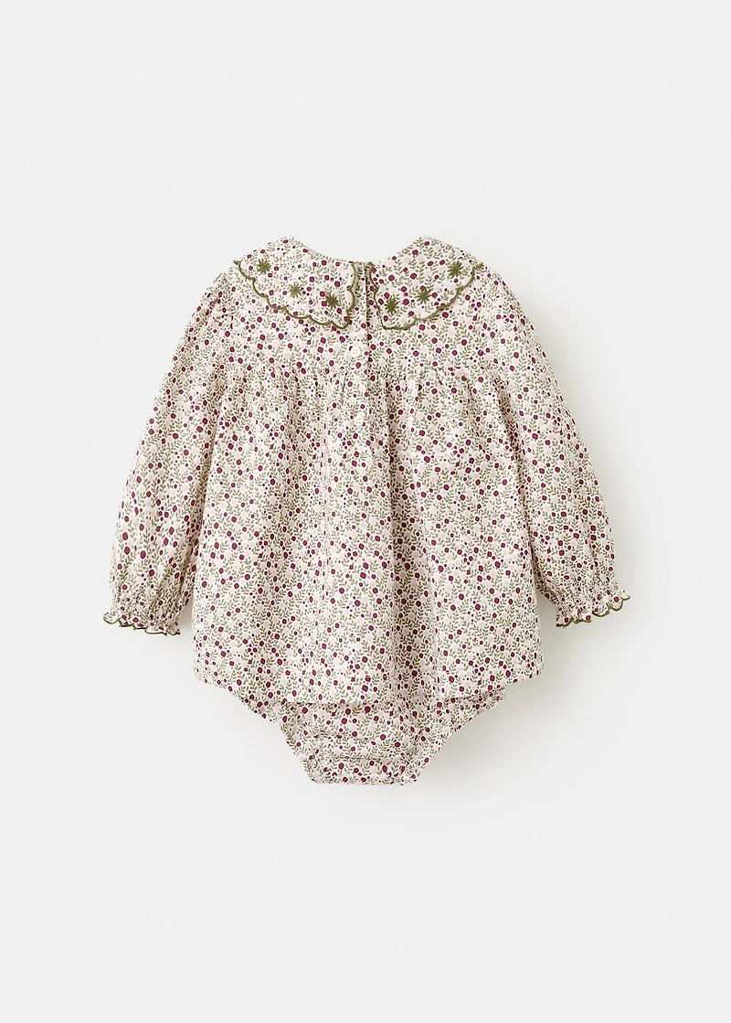 100% cotton fabric. Floral print design. Embroidered design. Embroidered neck. Peter Pan collar. Long sleeves with elastic cuffs. Button closure at the back. Printed cotton diaper cover.