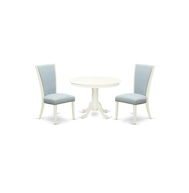 East West Furniture wooden dining table set of two amazing dining chairs with Linen Fabric Baby Blue color and a fantastic 42-Inch Antique dining tabl