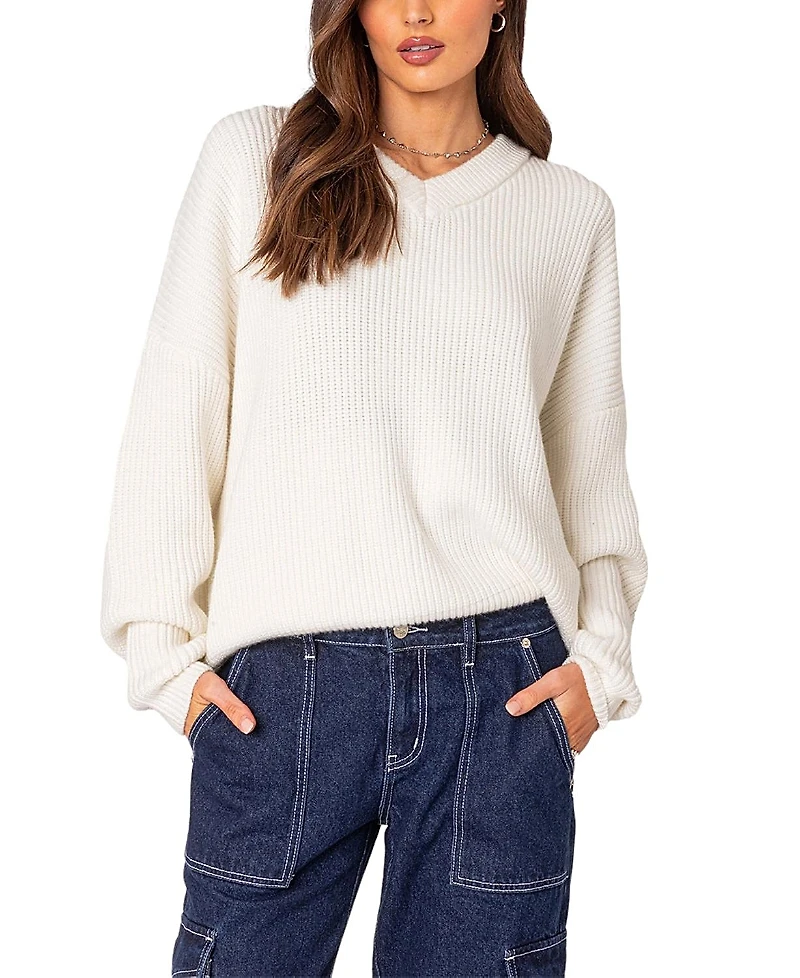 Edikted Denny Oversized V Neck Sweater.Color:White.Size:XS/S.Material:50% Polyester 50% Rayon.Sweaters.