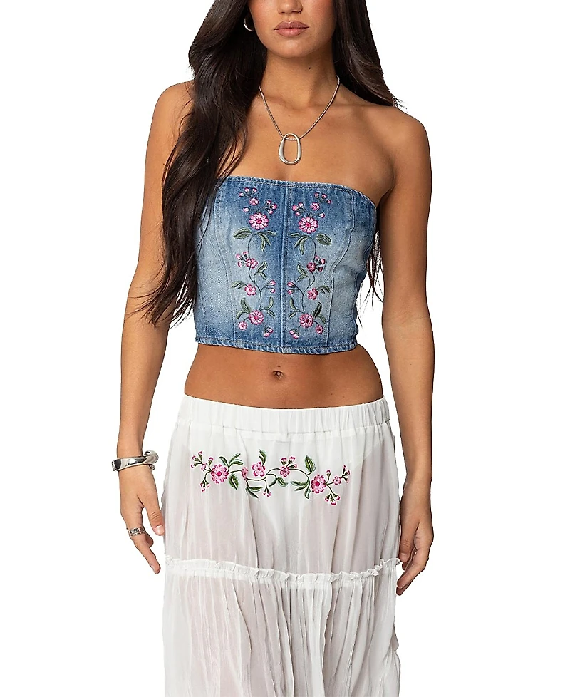 Edikted Tula Embroidered Denim Corset.Color:Blue.Size:S.Material:100% Cotton.Tops.