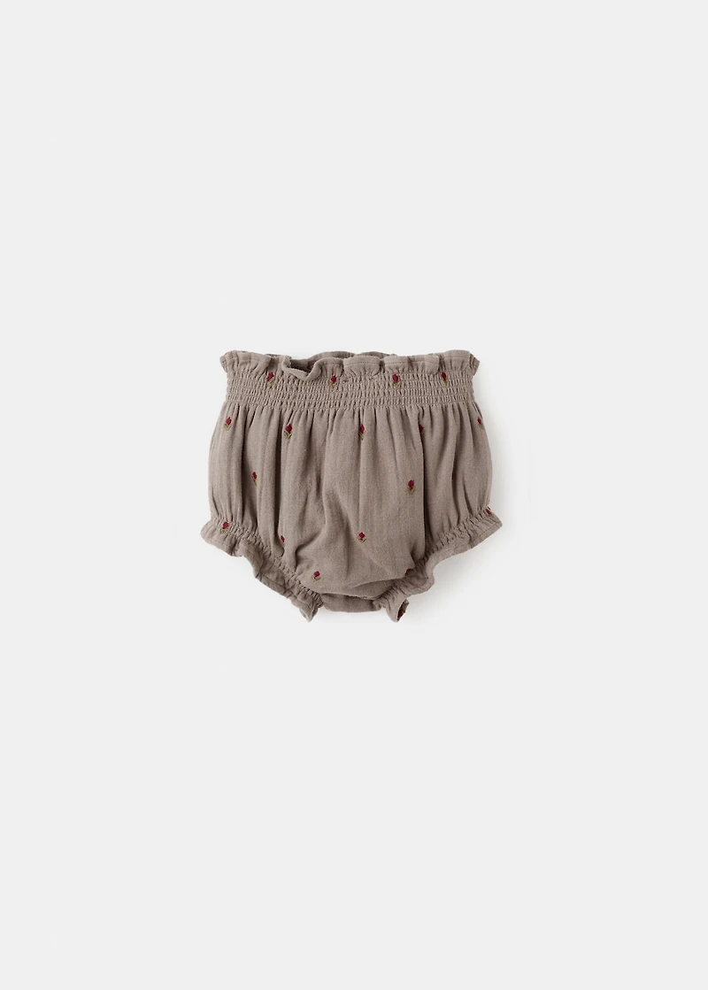 100% cotton fabric. Short design. Embroidered design. Floral embroidery. Gathered ends. Elastic trims. No closure.