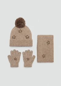 knitted fabric, embroidered design, floral embroidery, available set, matching hat, scarf and gloves