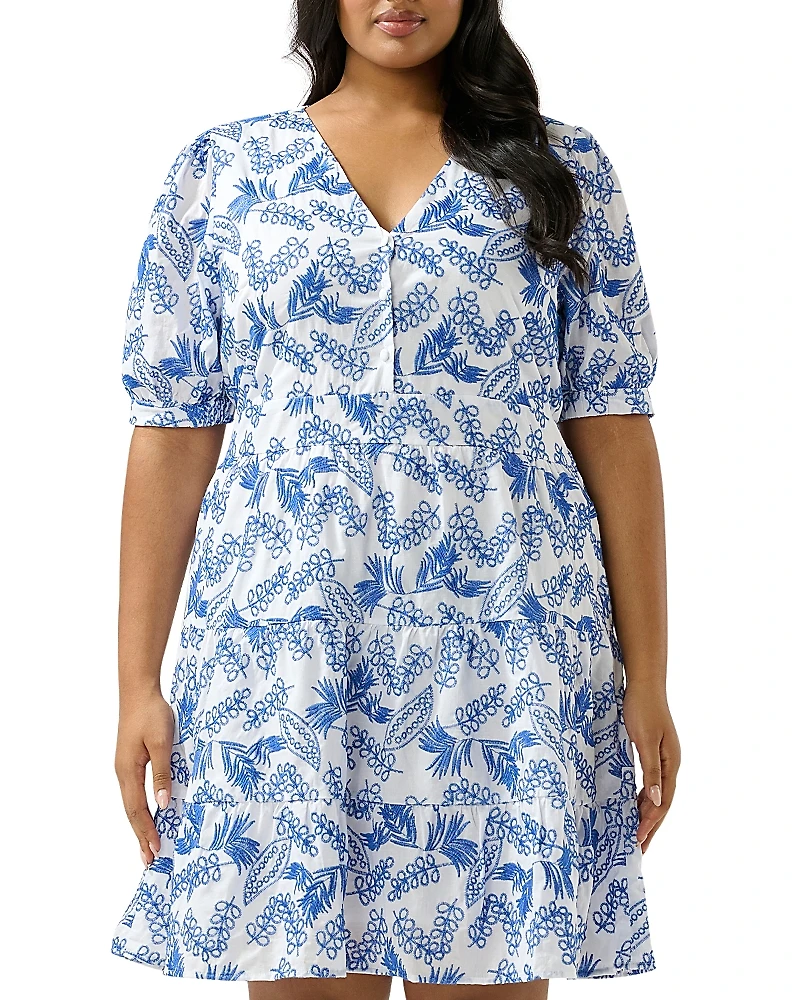 Estelle Plus La Croisette Embroidered Dress.Color:Blue/ Milk.Size:16W.Material:Shell & lining: 100% cotton.Dresses.