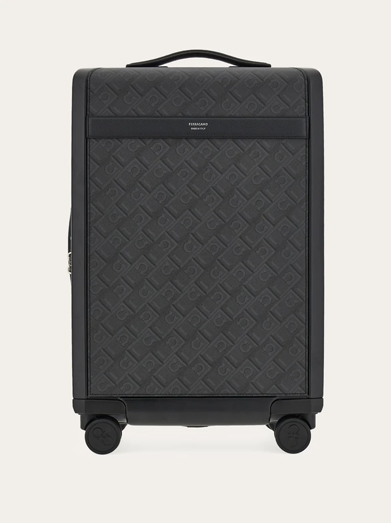 Semi-rigid cabin case with embossed Gancio pattern on the front. Four wheels ensure the perfect 360° spin. The ultra light structure features a combination lock and extendible handle.