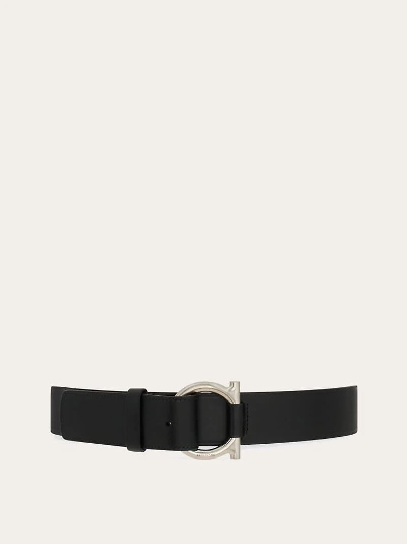 Understated belt with geometric-profiled strap and topstitching along the edge. The Gancini buckle with sliding fastening mechanism adds a refined edge, thanks to the aged palladium finish. Adjustable length. Easily cut the belt strap or punch another hole for a tighter or looser fit. A customization service is also available in all Ferragamo boutiques.