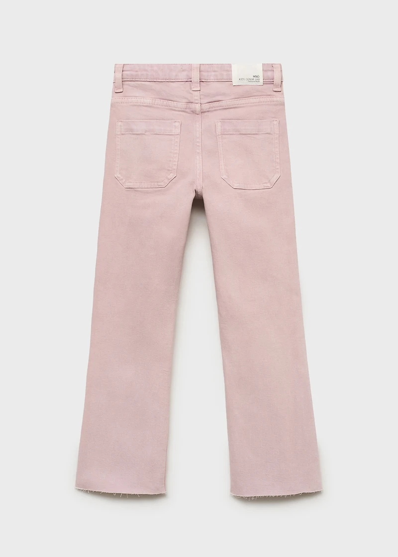 Cotton fabric. Stretch fabric. Long design. Flare design. Belt loops. Button and zipper closure. Adjustable waist with inner elastic. Two front patch pockets. Studded detail. Two pockets on the back. Frayed hem.