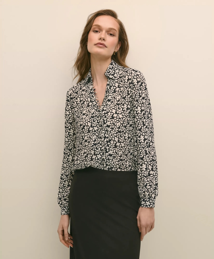 In a chic black and white motif, our floral shirt adds a point of interest to your minimalist looks. Loop buttons and subtle sleeve shirring finish it with a feminine touch.