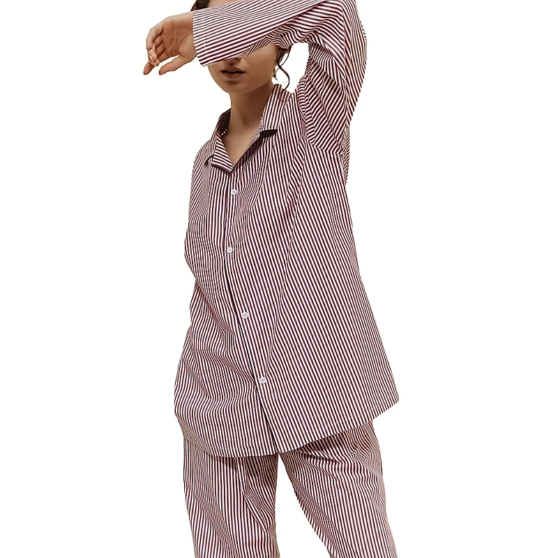 A fresh take on a traditional look, this pinstriped tailored cotton poplin pajama set features a crisp structure and refined contrasting piping. Designed with a relaxed fit to offer comfort with a sleek, unisex silhouette