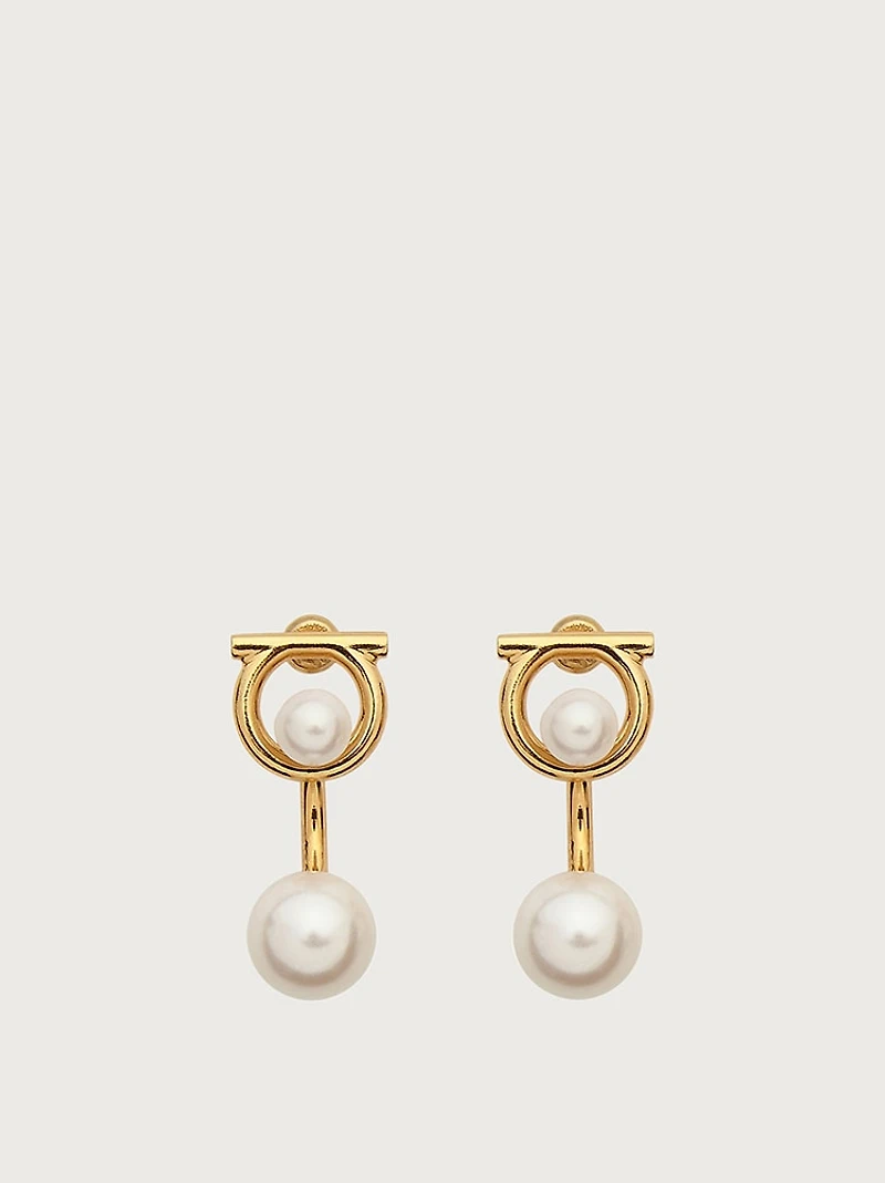 Modern interpretation of the Gancini earring, with a flat silhouette and a tilting element decorated with a beautiful pearl bauble. The shape is inspired by body piercing, for a rock chic touch with your daily looks.