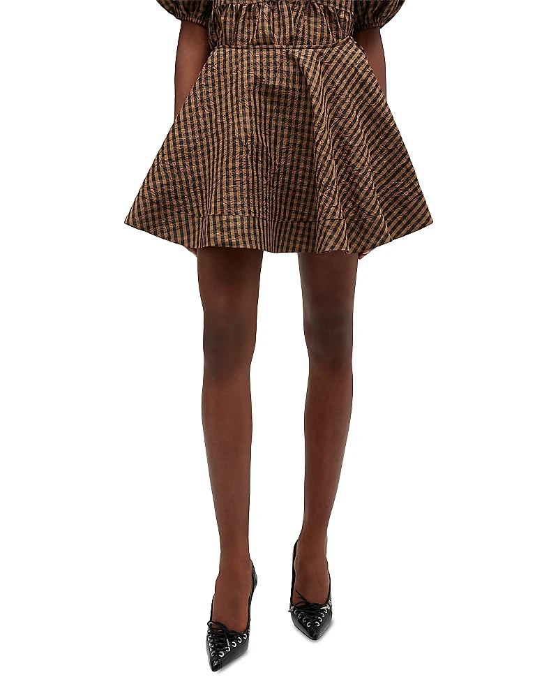 Ganni Crinkled Check Mini Circle Skirt.Color:Tobacco Brown.Size:32 EU/ 0 US.Material:100% polyester.Skirts.