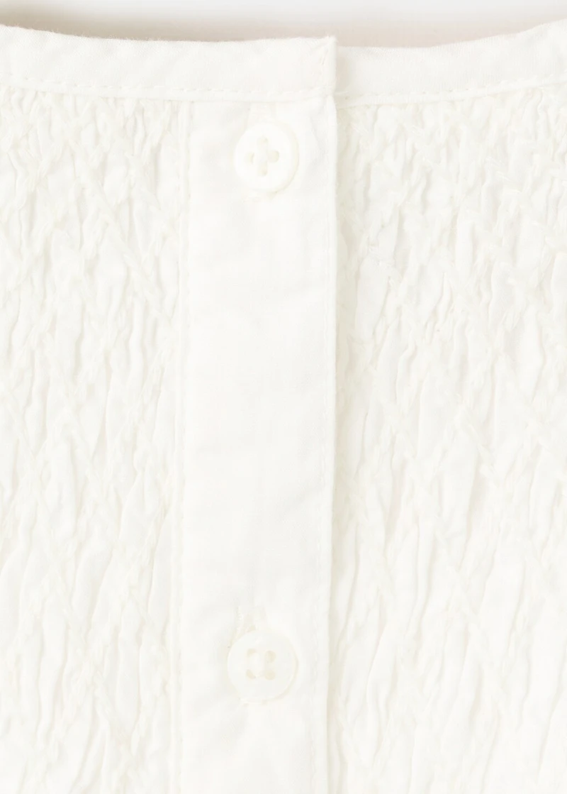 100% cotton fabric. A-line design. Ruched Details. Honeycomb pattern. Rounded neck with button fastening. Long sleeves with ribbed trims.