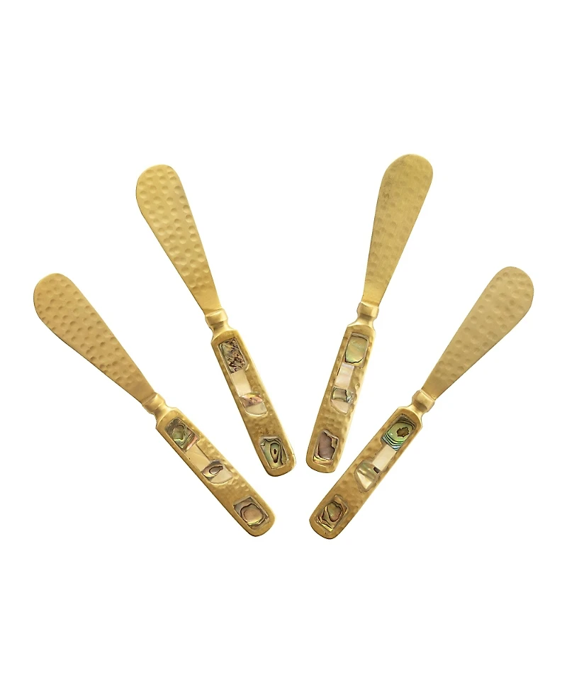 Your guests will be captivated when they lay eyes on the exquisite Sisley Butter Knives. Crafted from stainless steel with a luxurious matte gold finish, each knife showcases an intricate inlay work of lustrous mother of pearls, adding a touch of opulence to your table.Handcrafted by a skilled artisans, these gold butter spreaders reflect the artistry and skill involved in their creation. From the careful shaping to the final polish, every piece is a testament to exceptional craftsmanship, ensuring that your dining experience is elevated to new heights of elegance.Measurements: 6.5" x 1"Materials: Stainless steel and MOPFinish: Matte goldPackage: Set of 4Origin: Responsibly made and sustainably sourced from IndiaWork of art: Each handcrafted piece is unique, revealing the beauty of natural materials and the artisan s artistryCare: Hand wash the knives using warm water and mild soap. Dry it promptly to avoid moisture damage. To preserve the natural luster, periodically wipe with a soft cloth.