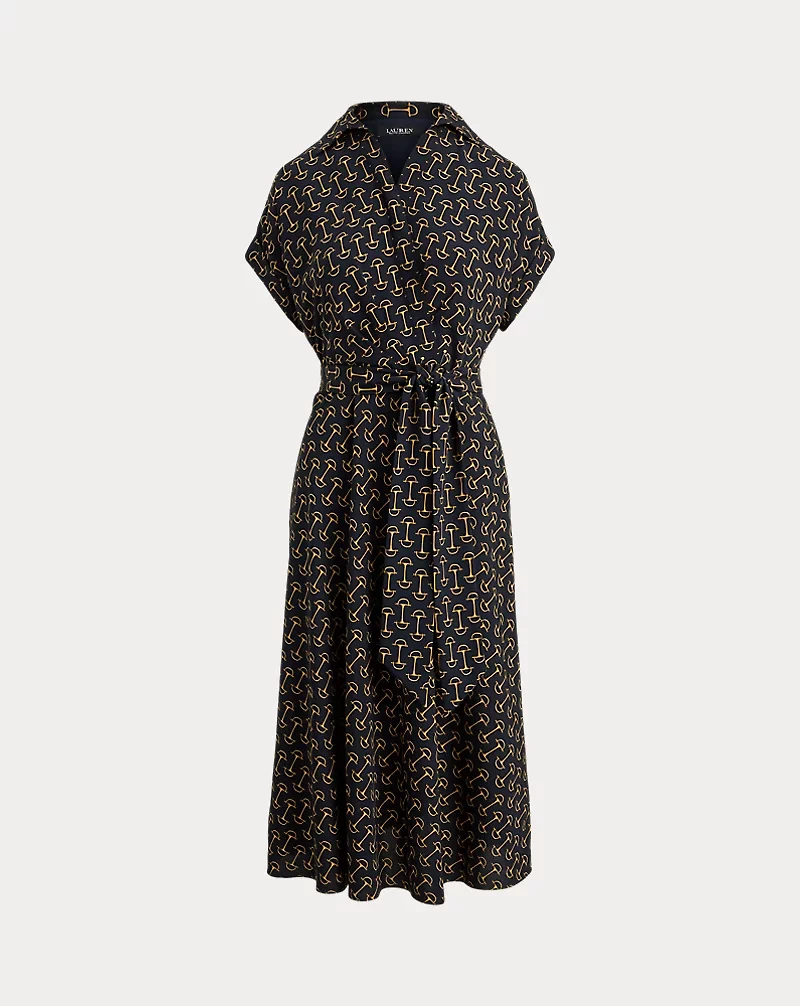 Crafted with airy crepe de chine, this dress balances a spread collar and roll-tab sleeves with a feminine surplice neckline to create a look that is casual yet refined. Detailed with “LRL”-engraved buttons, this version displays the season’s equestrian-inspired geometric print.