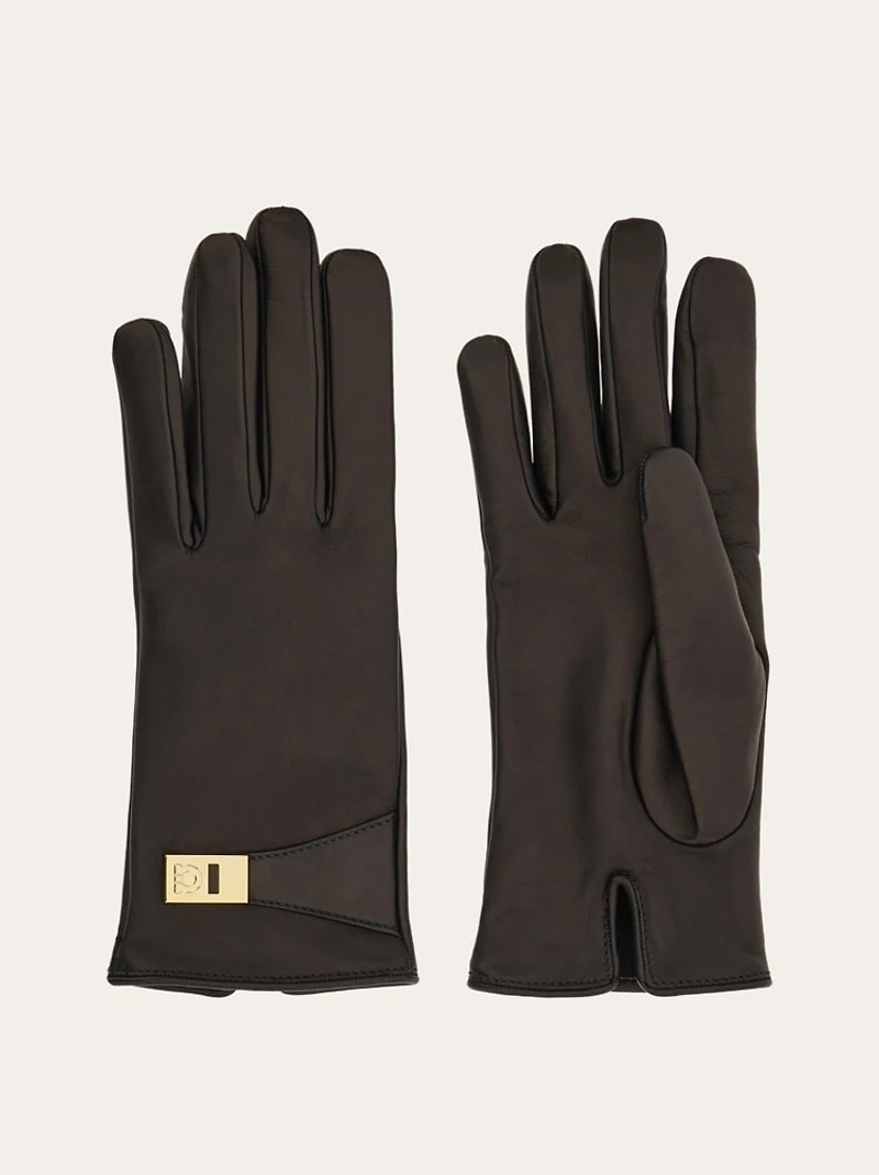 Refined gloves made of soft calf leather, decorated on the outside with a Ferragamo Hug buckle in a gold finish. The interior is lined in cashmere for flawless warmth and comfort.
