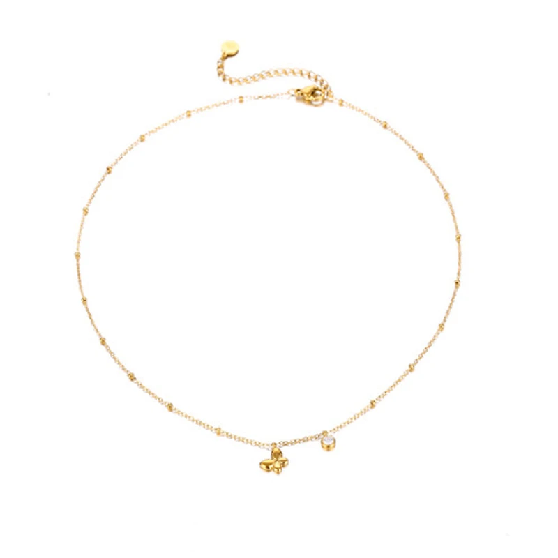A sweet balance of shine and charm. This dotted gold chain holds a delicate butterfly pendant paired with a small sparkling gemstone for just the right touch of elegance.