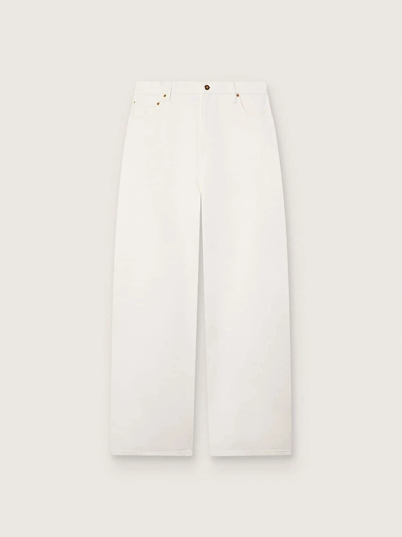 These women's jeans with a boyfriend fit feature an oversized fit, a straight cut and a classic five-pocket design, and are made from optical white cotton bull denim. The gold double star embroidered on the back completes the look.