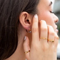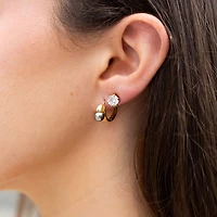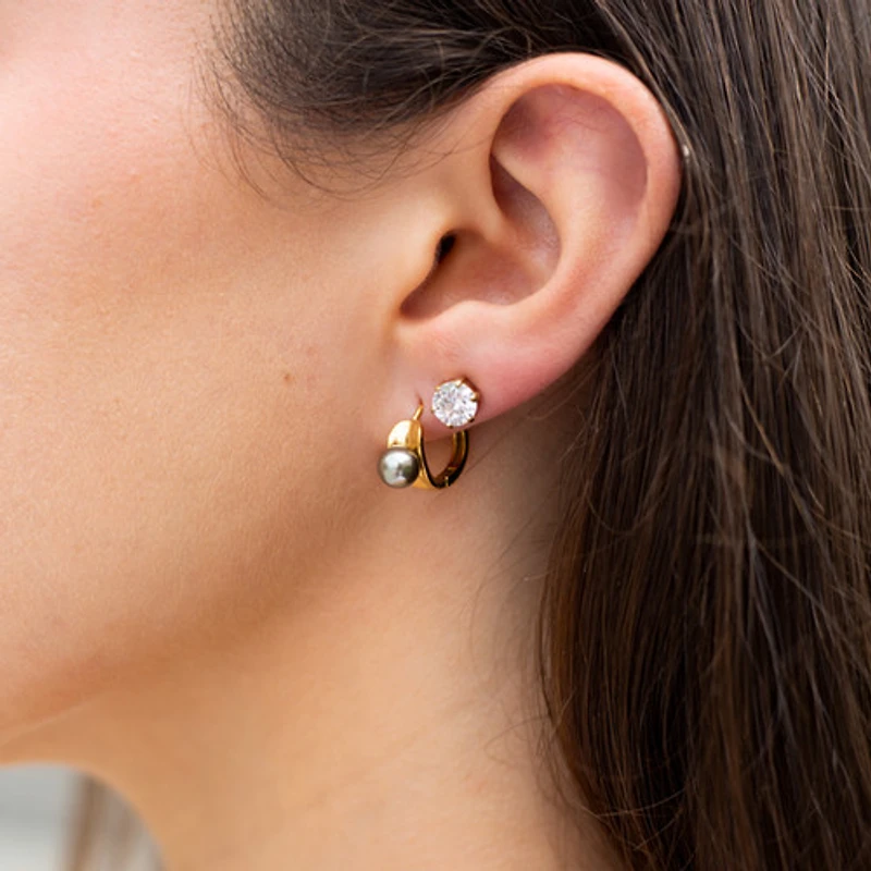 A new twist on a classic look. An elegant gray pearl sits on these gold hoops. Eye-catching, but not over the top.