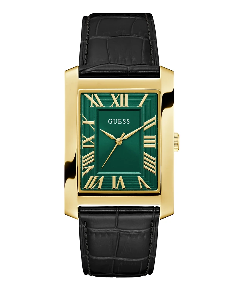 Tailored precision for everyday ease. A crisp rectangular case in polished gold-tone Stainless steel frames a green sunray dial with deep, dimensional color for a look that is smart, modern, and unmistakably Guess. The black croco-embossed leather strap adds tailored texture. The refined angles and slim case make this dress watch versatile by design so you can be ready for the meeting, the dinner, and every move in between.