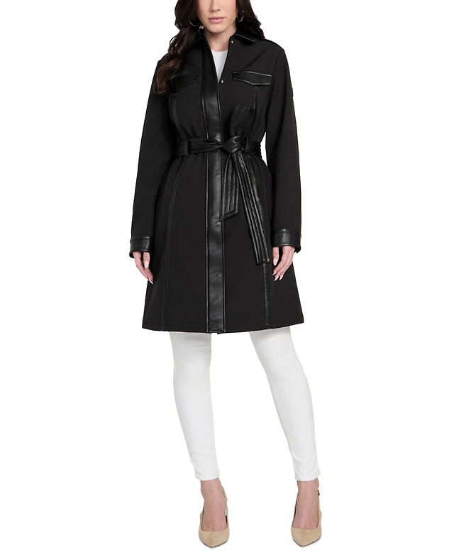 Guess Women's Faux-Leather-Trim Belted Trench Coat