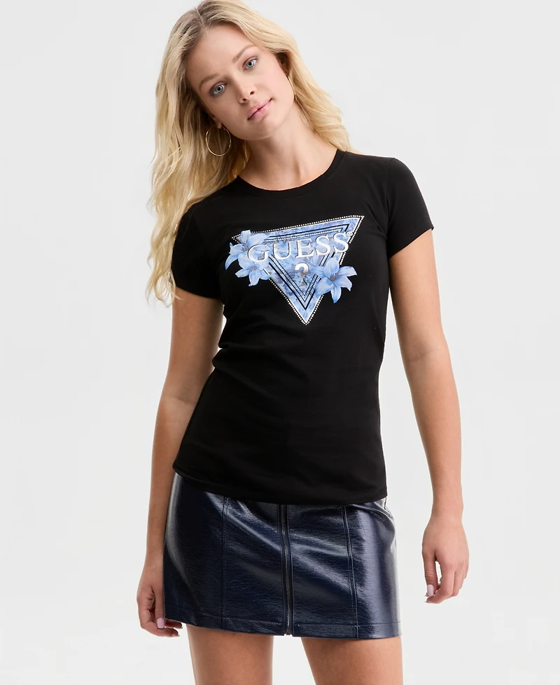 Guess' memorable T-shirt features a bold triangle logo framed by vibrant blue florals for a perfect blend of iconic branding and artistic flair.