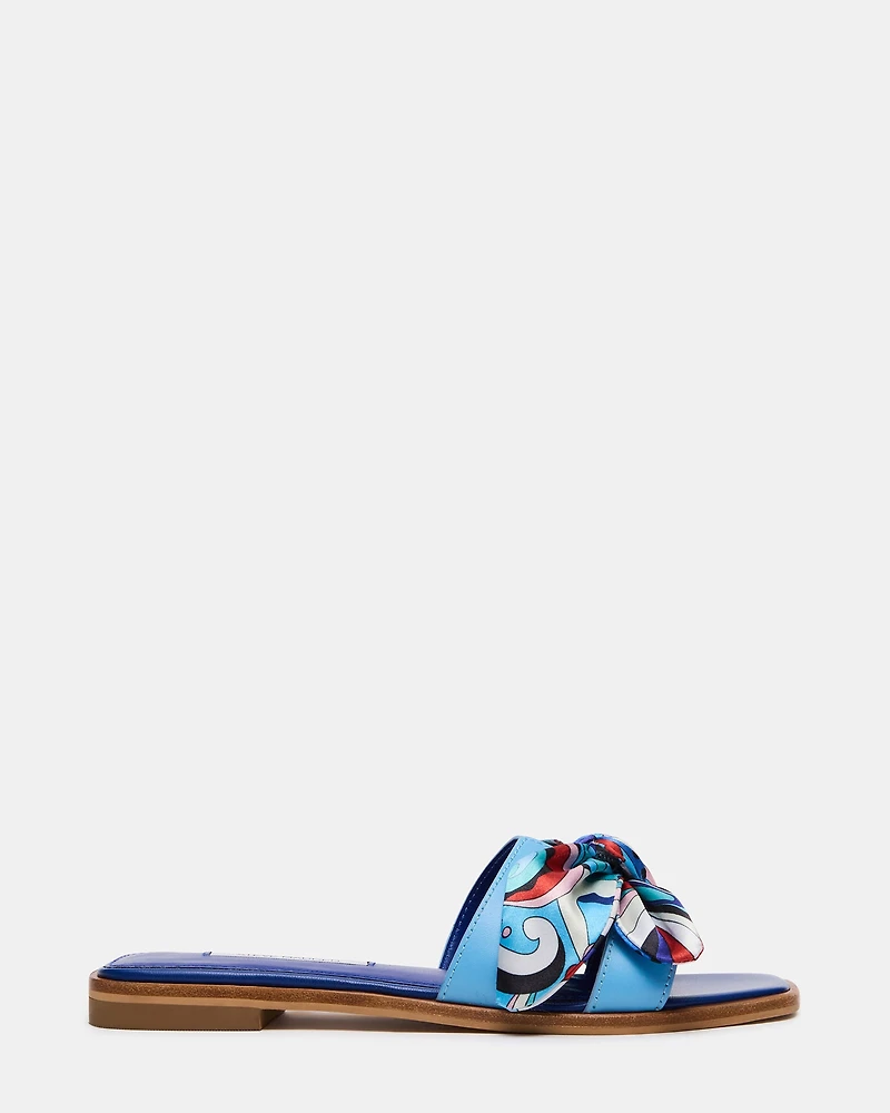 Geometric cutouts on the wide single strap of the HADYN BLUE SCARF slide give this flat sandal design a fresh feel.
