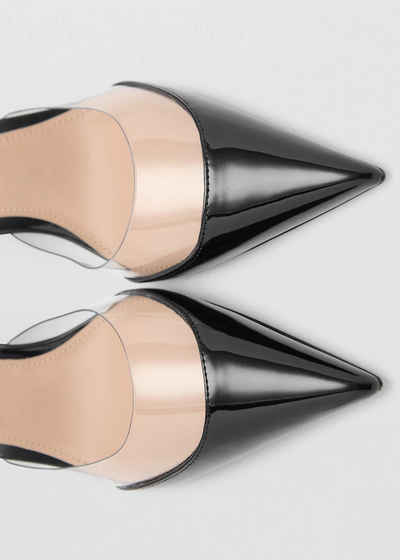 Midi heel. Transparent vinyl panel. Pointed. No closure. The blue color is an online exclusive. Heel height: 5.5 cm.