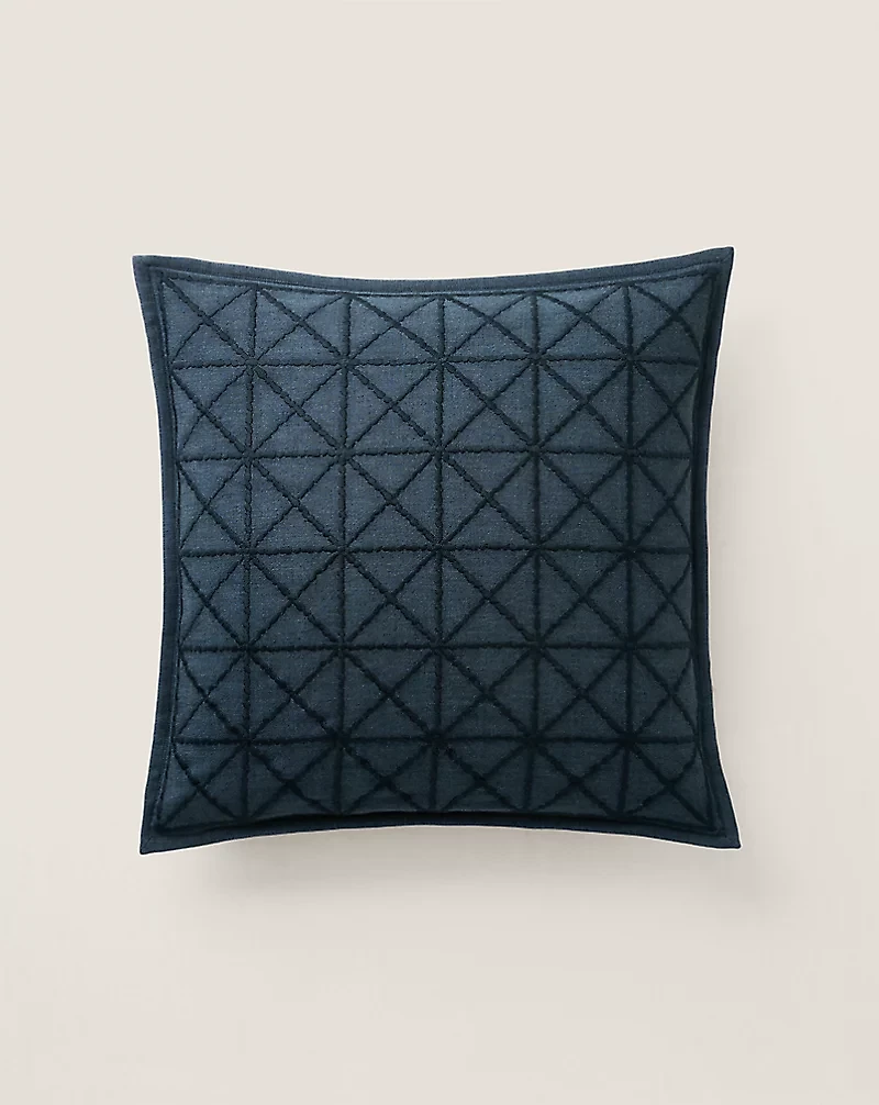 Presented in a rich indigo hue, the Henley Throw Pillow is woven from supple Belgian linen with an embroidered geometric motif.